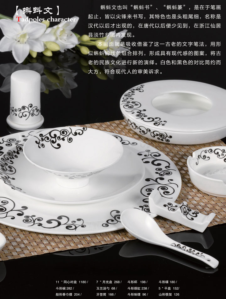 11寸同心衬盘、7寸月光盘、斗形杯、斗形碟、斗形碗、玉兰汤勺、斗形烟缸、5寸平盘、船形香巾碟、牙签筒、斗形味碟、山形筷架。