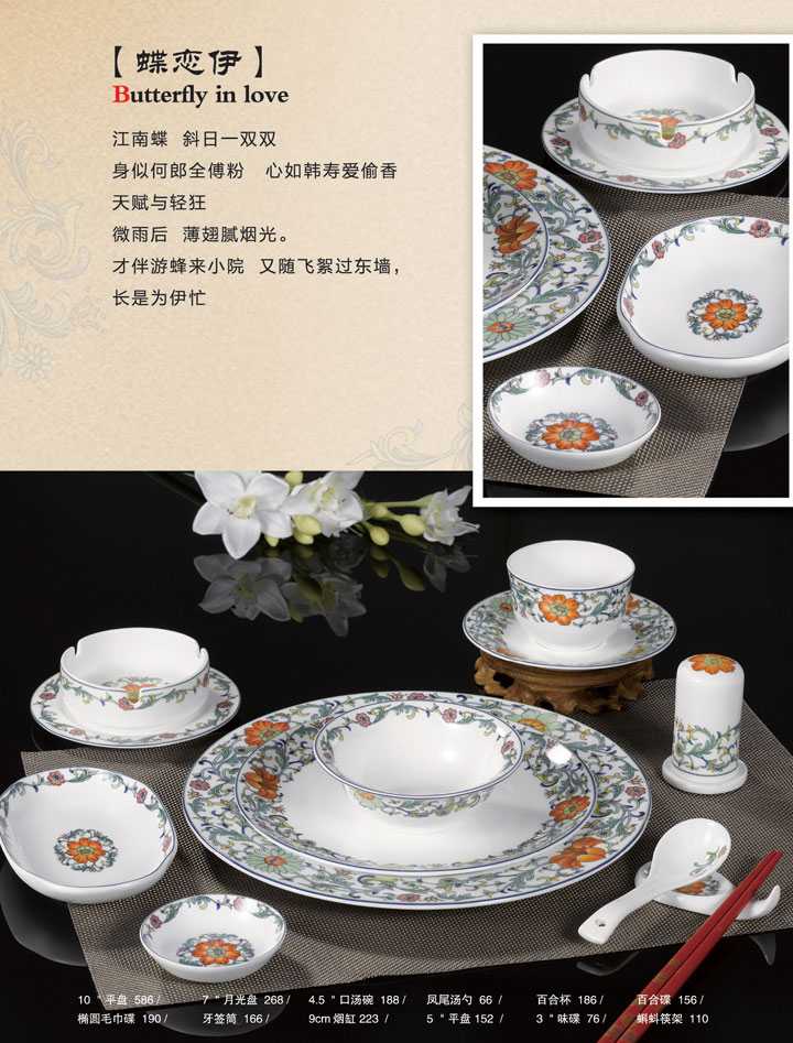 10寸平盘、7寸月光盘、4.5寸口汤碗、凤尾汤勺、百合杯、百合碟、椭圆毛巾碟、牙签筒、9cm烟缸、5寸平盘、3寸味碟、蝌蚪筷架。