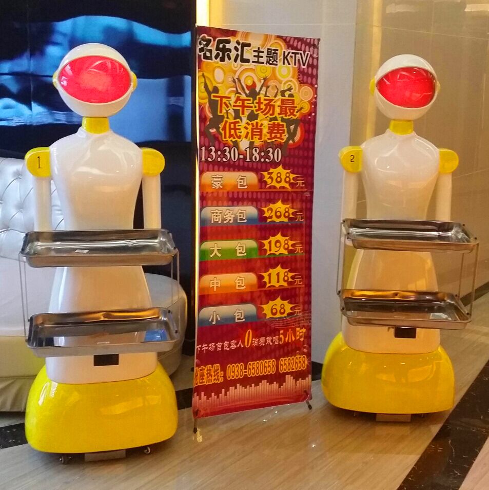 送餐机器人俗称智能运输机器人,是将做好的餐饮产品按时送到指定的餐桌的服务,该机器人具有自主行走能力,并且自主躲避障碍物等相关的安全防护措施。机器人在检测到已放置食物,并接收到送餐桌号指令后,将自动沿磁条行至对应桌号的餐桌,旋转90度面向顾客,同时发出语音提醒(可自行设置所发语音),待检测到顾客已将食物取下后,将原地旋转回轨道,并返回取餐点待命。在行走途中,如果遇到障碍物,机器人将会发出语音提醒。